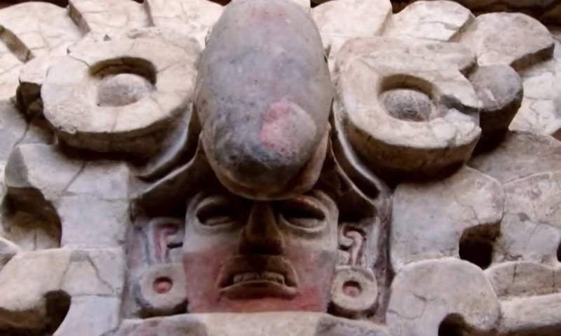 En la entrada de la antecámara resalta la figura de un búho, símbolo de la noche y la muerte, cuyo pico cubre el rostro estucado de un dignatario, posiblemente el antepasado al que se dedicó el recinto.