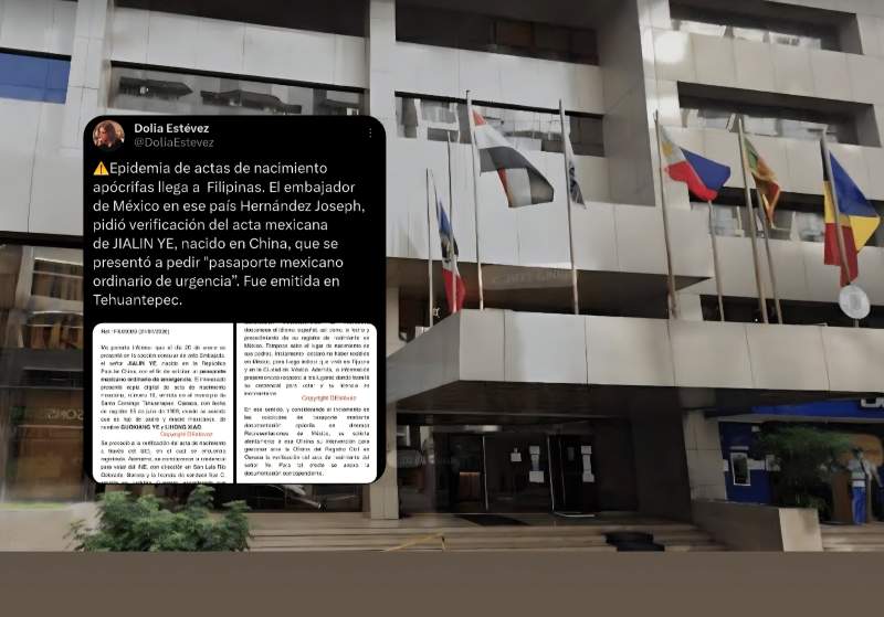 Según información revelada por la periodista Dolia Estévez, el embajador de México en Filipinas, Joseph Hernández, solicitó una verificación urgente de un acta de nacimiento emitida en el municipio de Santo Domingo Tehuantepec, la cual fue presentada por un ciudadano nacido en China que pretendía obtener un pasaporte mexicano de emergencia.