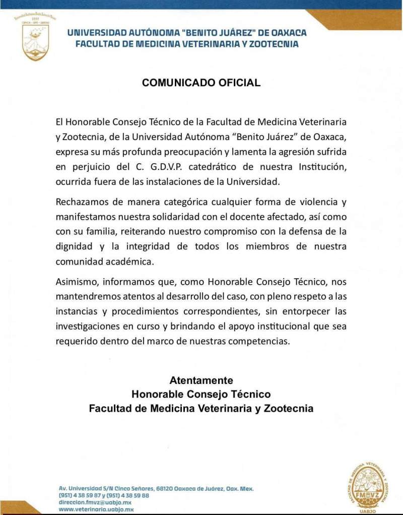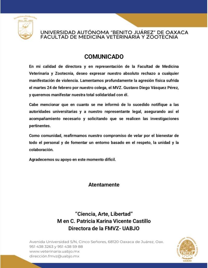 En contraste con la pasividad de la Rectoría, la Directora de la Facultad de Veterinaria y el Honorable Consejo Técnico emitieron un pronunciamiento de rechazo a cualquier forma de violencia.